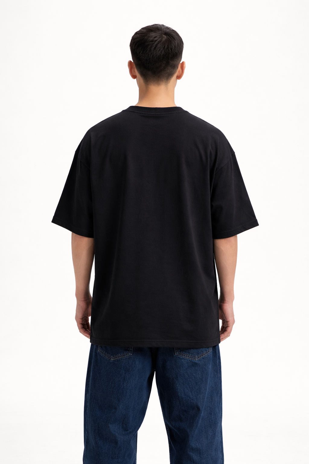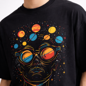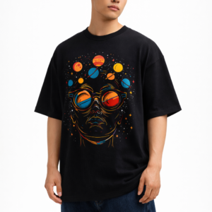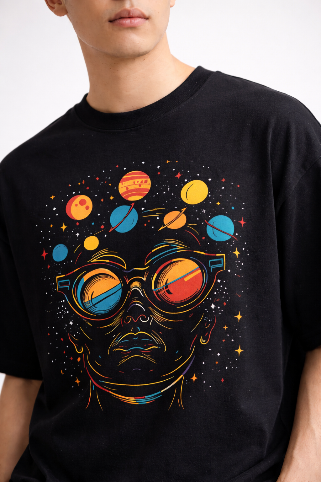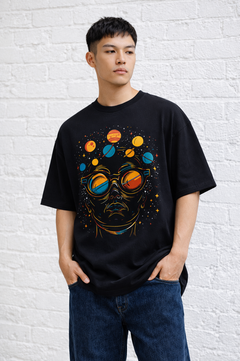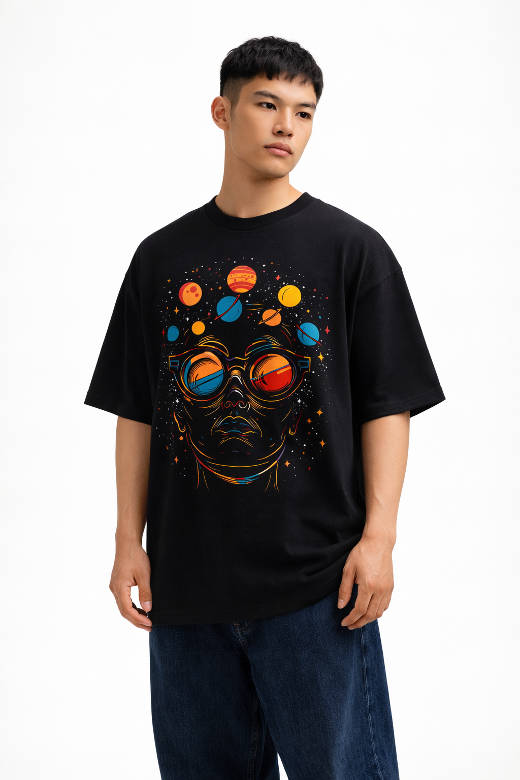 Featuring a psychedelic space-inspired artwork printed on deep black fabric, this oversized t-shirt blends modern street style with premium comfort.